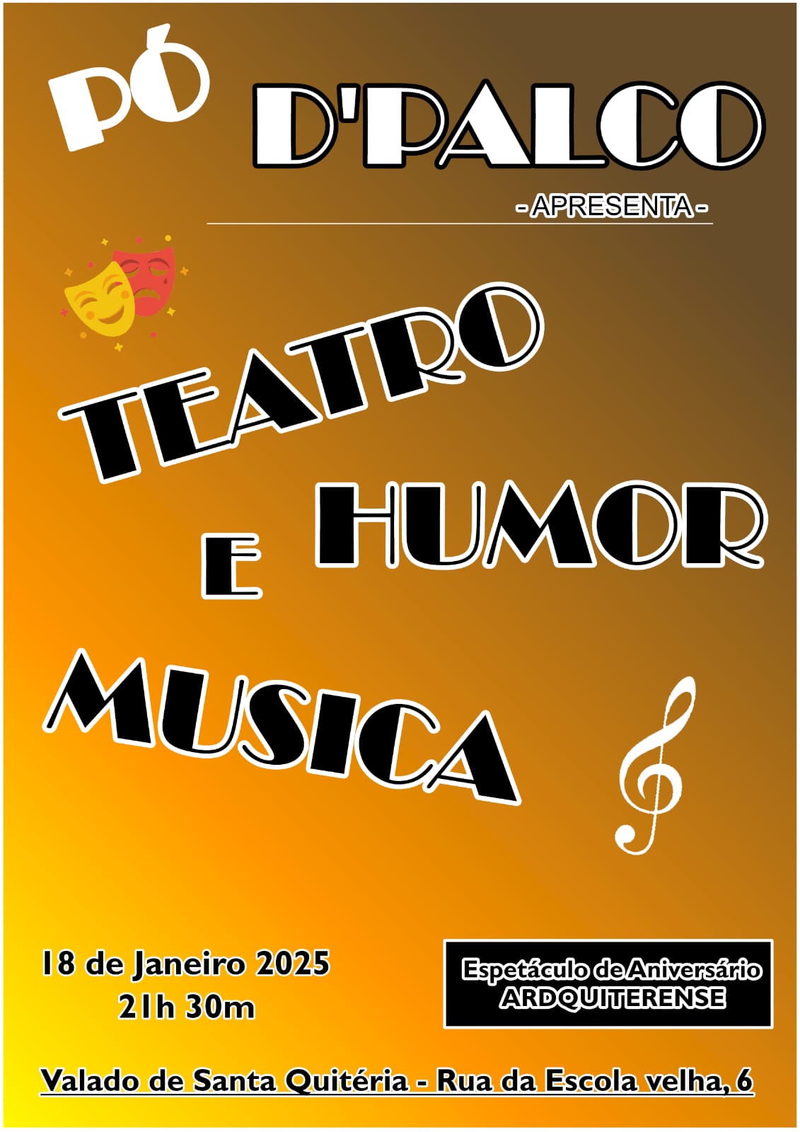 No dia 18 de janeiro, pelas 21h30, o grupo de teatro Pó D’Palco apresenta um espetáculo de teatro, humor e música, no Valado de Santa Quitéria.
