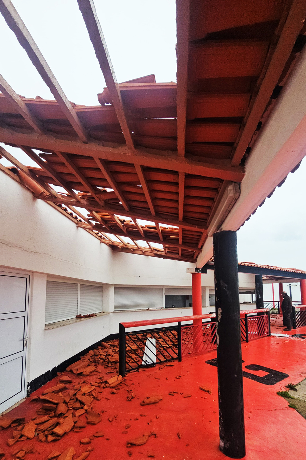 Sofreu danos consideráveis na cobertura da bancada, na cobertura do bar, janelas e estores do bar e na iluminação.