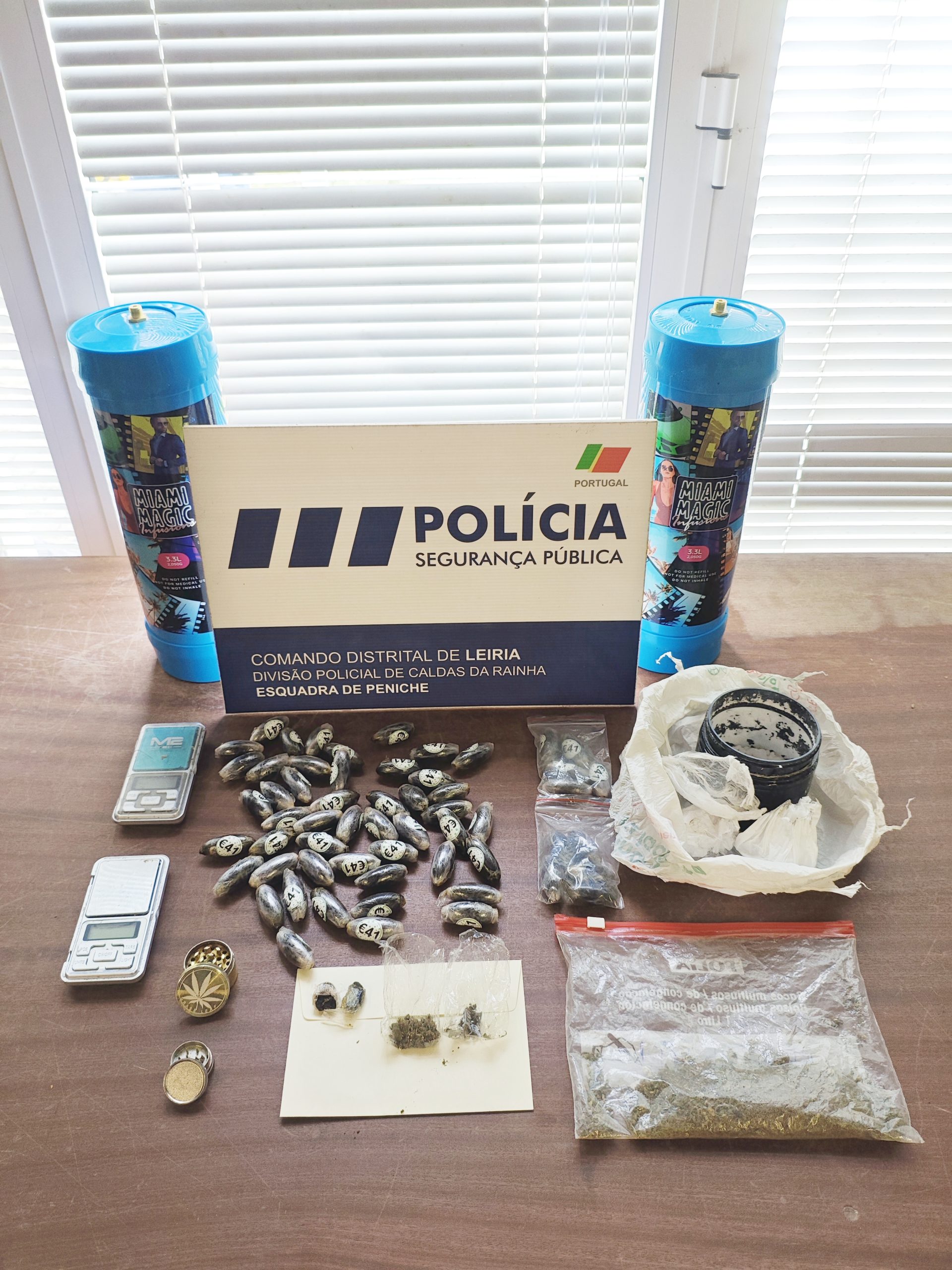 No dia 24 de junho, numa operação fora da cidade de Peniche, com o apoio do Comando Territorial da GNR de Leiria, do Grupo de Intervenção de Ordem Pública e do Grupo de Intervenção Cinotécnica da GNR, a PSP deteve um dos principais suspeitos, com 23 anos. Estavam na sua residência 625,82 gramas de canábis resina e 11,51 gramas de canábis folhas e sumidades, um moinho triturador de produto estupefaciente e uma balança digital de precisão.