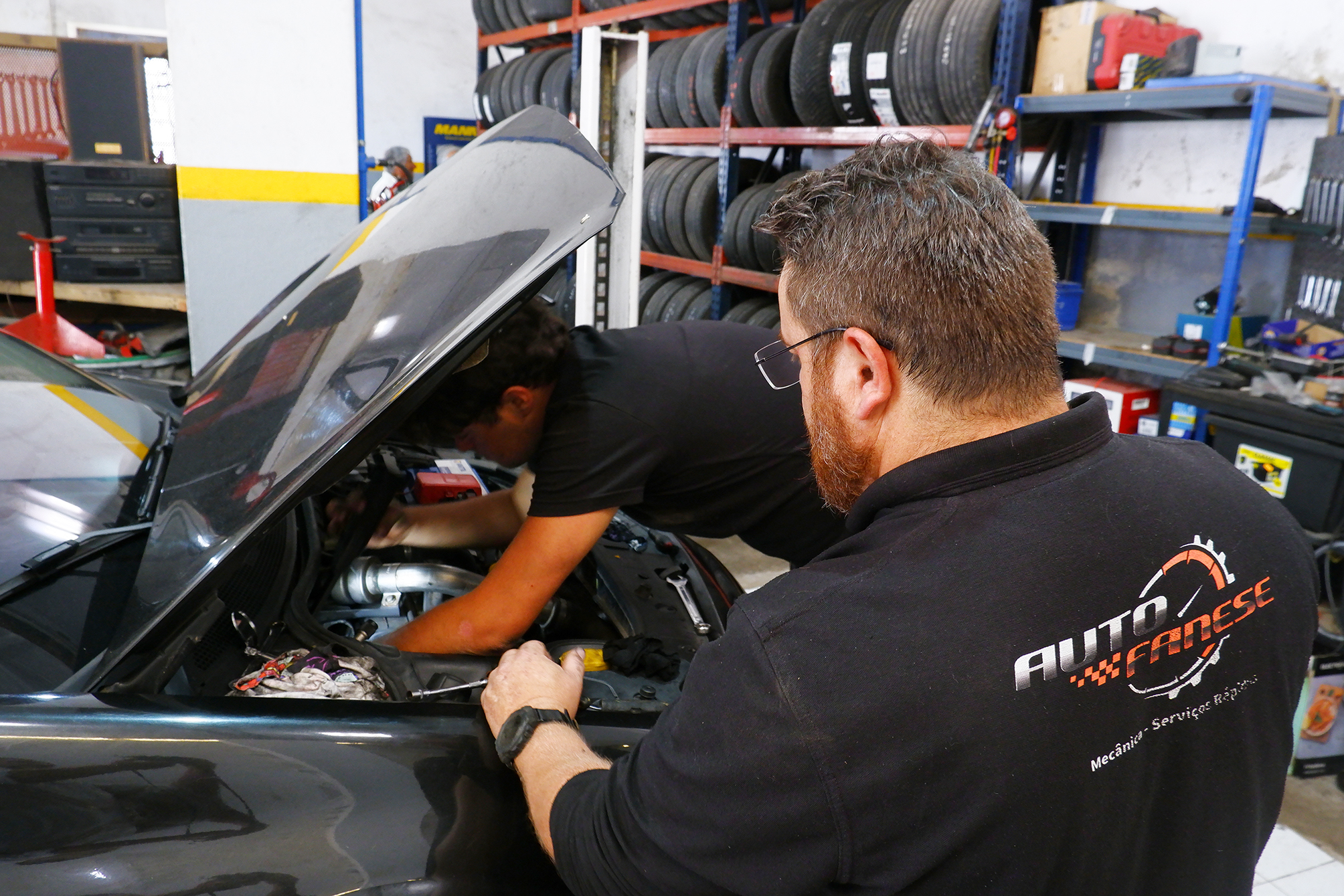 Um trabalho que é feito em equipa com Manoel da Silva, da Pneus Express, uma empresa que funciona na mesma localização.